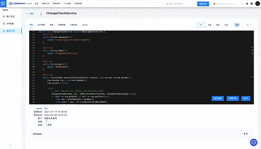 技术实现层面,蚂蚁监控技术团队主要基于serverless能力,做了一个领域性的研发与运行平台,让用户的定制化诉求能直接在这个平台通过写一段代码的方式得到满足。这里可以直观地看到一个检查变更的服务函数的产品效果: