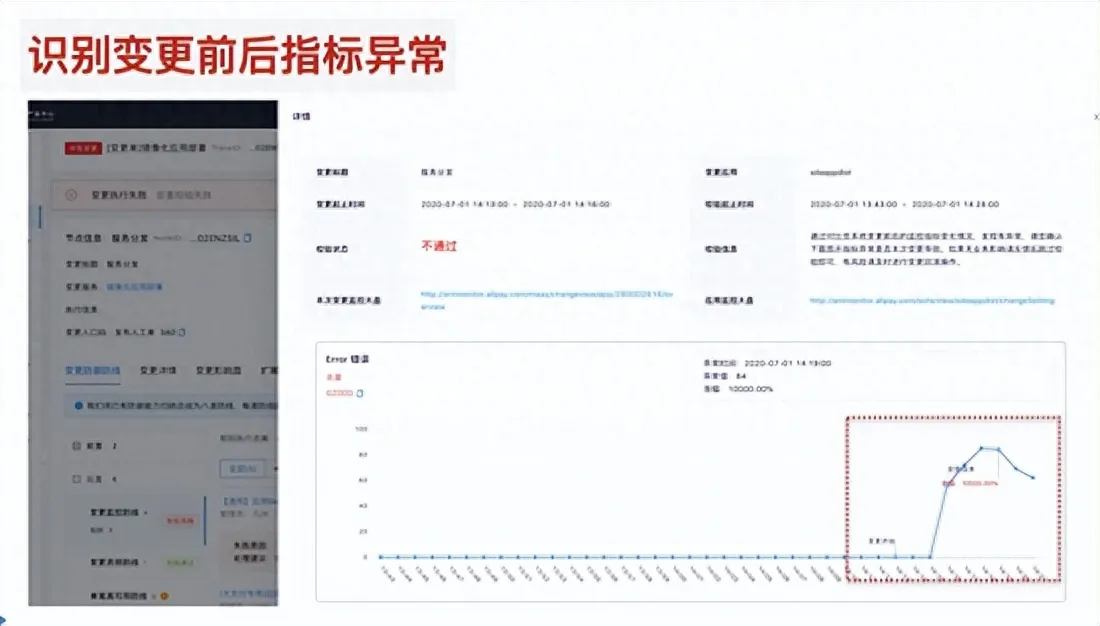 经过对蚂蚁多年的故障分析,可以发现60%以上的故障都是人为变更导致的,因此沉淀了 智能分批监控、错误码检测、跨链路检测、变更资损检测、变更窗口检测 等多种防御微服务,包含6000多个防御规则,每天256万次自动化的防御风险校验,自从有了这套架构,每年变更故障下降50%左右。