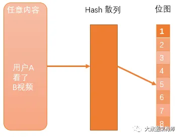 上图中,用户A看了视频B,hash后的值是5,那么第5位的值就变成1了。如果我们想判断用户A是否看了视频B,只要看看第5位是不是1就可以了。