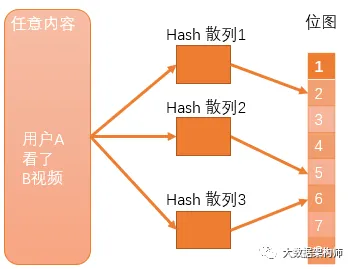 - 用户A看视频B,3次hash散列结果是2、5、6;