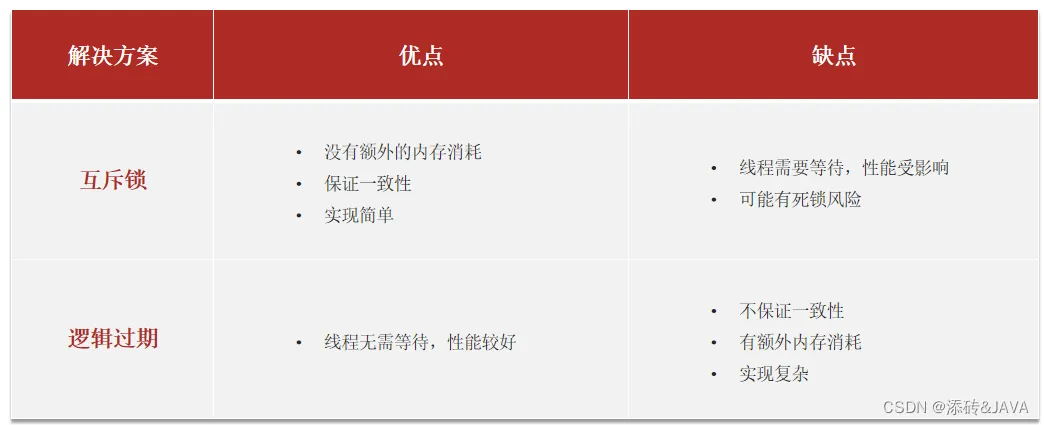 逻辑过期方案: 线程读取过程中不需要等待,性能好,有一个额外的线程持有锁去进行重构数据,但是在重构数据完成前,其他的线程只能返回之前的数据,且实现起来麻烦