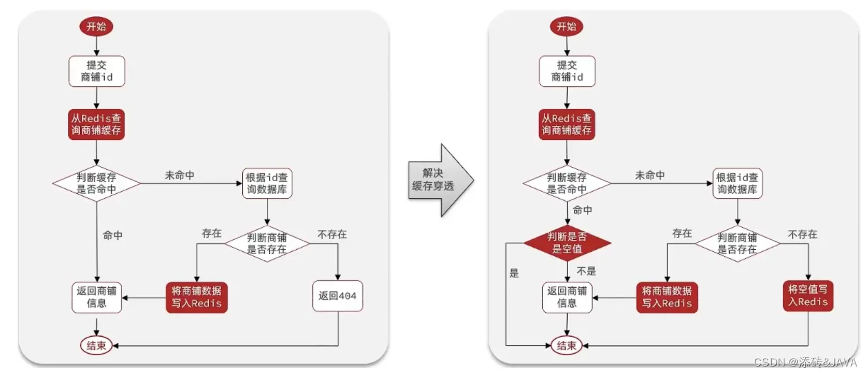 现在的逻辑中:如果这个数据不存在,我们不会返回404 ,还是会把这个数据写入到Redis中,并且将value设置为空,当再次发起查询时,我们如果发现命中之后,判断这个value是否是null,如果是null,则是之前写入的数据,证明是缓存穿透数据,如果不是,则直接返回数据。