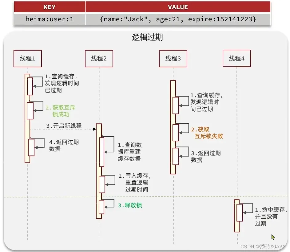 我们把过期时间设置在 redis的value中,注意:这个过期时间并不会直接作用于redis,而是我们后续通过逻辑去处理。假设线程1去查询缓存,然后从value中判断出来当前的数据已经过期了,此时线程1去获得互斥锁,那么其他线程会进行阻塞,获得了锁的线程他会开启一个 线程去进行 以前的重构数据的逻辑,直到新开的线程完成这个逻辑后,才释放锁, 而线程1直接进行返回,假设现在线程3过来访问,由于线程线程2持有着锁,所以线程3无法获得锁,线程3也直接返回数据,只有等到新开的线程2把重建数据构建完后,其他线程才能走返回正确的数据。