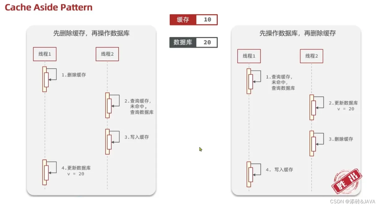 应该具体操作缓存还是操作数据库,我们应当是先操作数据库,再删除缓存,原因在于,如果你选择第一种方案,在两个线程并发来访问时,假设线程1先来,他先把缓存删了,此时线程2过来,他查询缓存数据并不存在,此时他写入缓存,当他写入缓存后,线程1再执行更新动作时,实际上写入的就是旧的数据,新的数据被旧数据覆盖了。