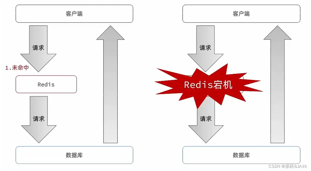 逻辑分析:假设线程1在查询缓存之后,本来应该去查询数据库,然后把这个数据重新加载到缓存的,此时只要线程1走完这个逻辑,其他线程就都能从缓存中加载这些数据了,但是假设在线程1没有走完的时候,后续的线程2,线程3,线程4同时过来访问当前这个方法, 那么这些线程都不能从缓存中查询到数据,那么他们就会同一时刻来访问查询缓存,都没查到,接着同一时间去访问数据库,同时的去执行数据库代码,对数据库访问压力过大。