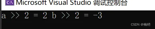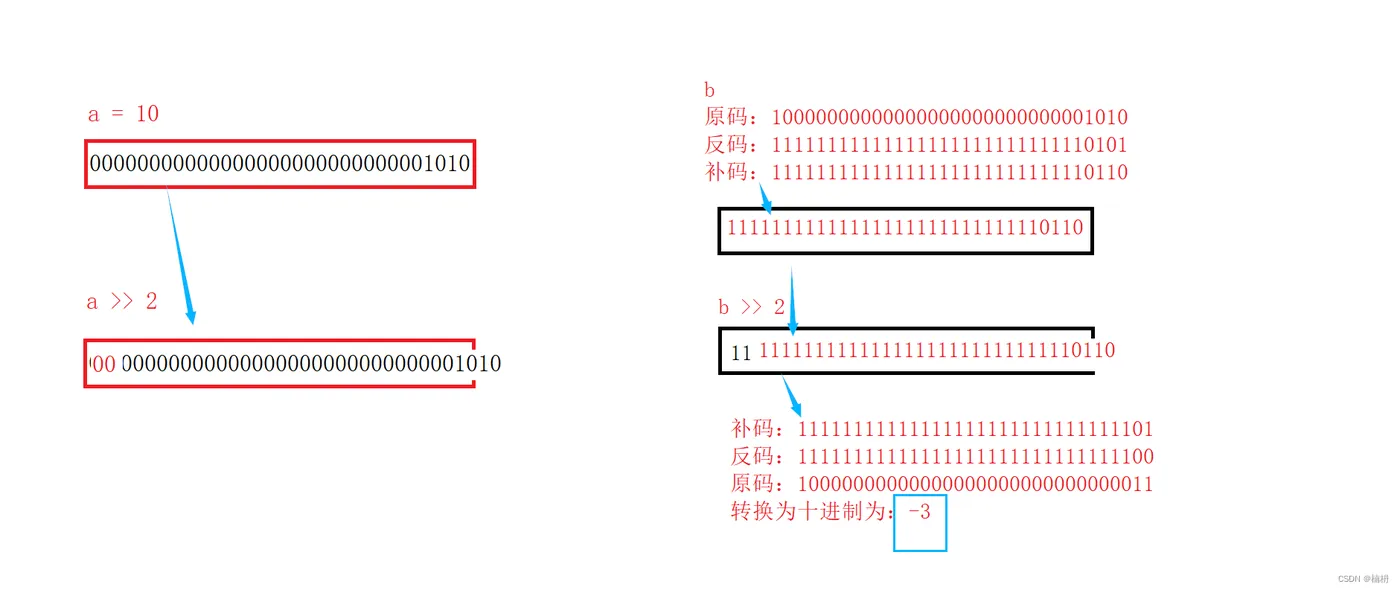intmain() { inta=10; intb=-10; intc=a>>2; intd=b>>2; printf("a >> 2 = %d b >> 2 = %d\n", c, d); return0; }