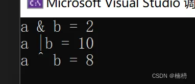 intmain() { inta=10;//1010intb=2; //0010printf("a & b = %d\na |b = %d\na ^ b = %d\n", a&b, a|b, a^b); return0; }