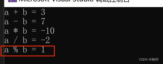 intmain() { inta=5; intb=-2; printf("a + b = %d\n", a+b); printf("a - b = %d\n", a-b); printf("a * b = %d\n", a*b); printf("a / b = %d\n", a/b); printf("a %% b = %d\n", a%b);//在打印%时,在%前加上%,表示后面的%用于打印return0; }