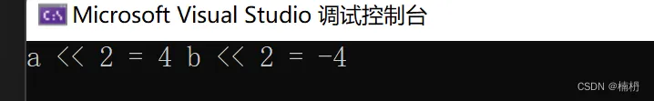 intmain() { inta=1; intb=-1; intc=a<<2; intd=b<<2; printf("a << 2 = %d b << 2 = %d\n", c, d); return0; }