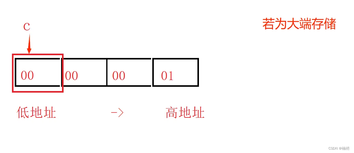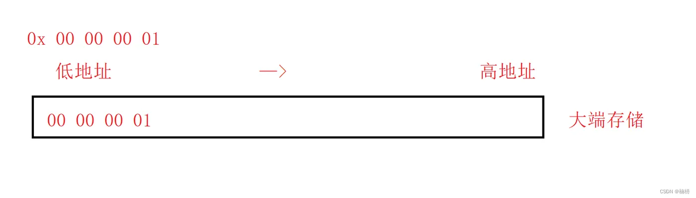 大端存储模式:数据的低位保存在内存的高地址中,数据的高位保存在内存的低地址中