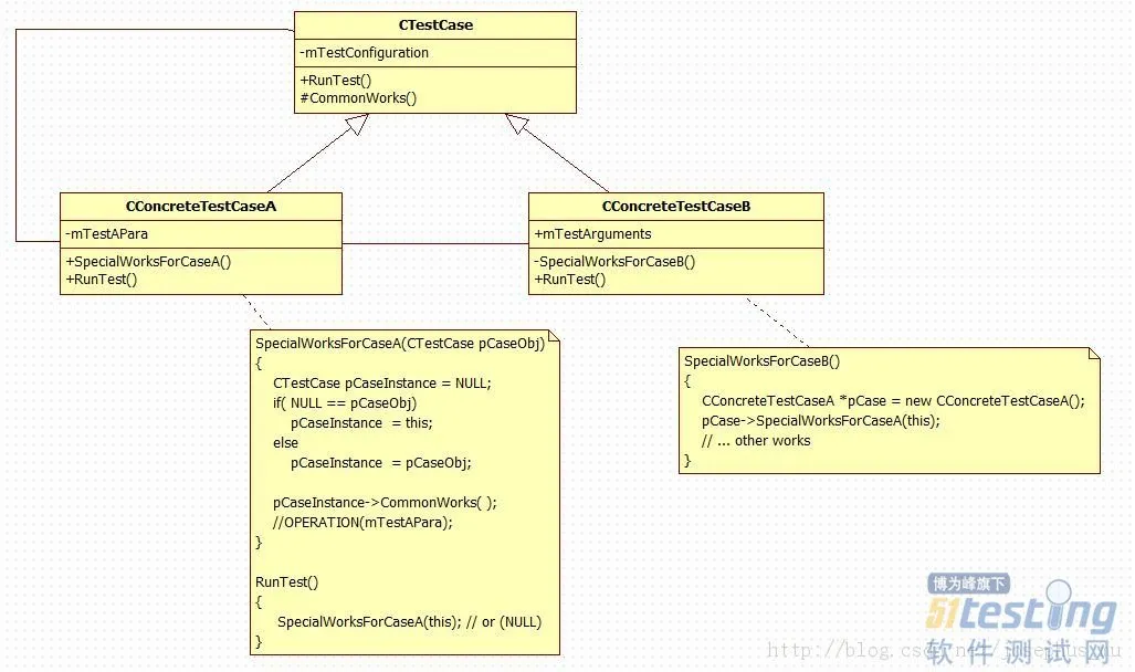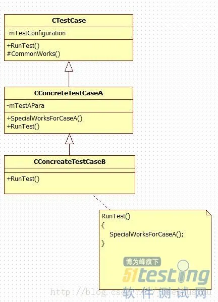 继承的方法RunTest用来实现具体的对特性A的操作,包括对特殊操作封装函数SpecialWorksForCaseA的调用;