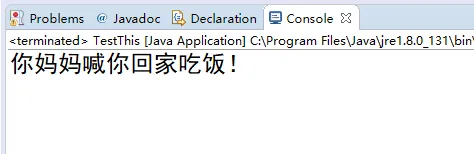 public class TestThis { int a, b, c; TestThis() { System.out.println("正要初始化一个Hello对象"); } TestThis(int a, int b) { // TestThis(); //这样是无法调用构造方法的! this(); // 调用无参的构造方法,并且必须位于第一行! a = a;// 这里都是指的局部变量而不是成员变量 // 这样就区分了成员变量和局部变量. 这种情况占了this使用情况大多数! this.a = a; this.b = b; } TestThis(int a, int b, int c) { this(a, b); // 调用带参的构造方法,并且必须位于第一行! this.c = c; } void sing() { } void eat() { this.sing(); // 调用本类中的sing(); System.out.println("你妈妈喊你回家吃饭!"); } public static void main(String[] args) { TestThis hi = new TestThis(2, 3); hi.eat(); } }