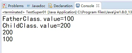 public class TestSuper01 { public static void main(String[] args) { new ChildClass().f(); } } class FatherClass { public int value; public void f(){ value = 100; System.out.println ("FatherClass.value="+value); } } class ChildClass extends FatherClass { public int value; public void f() { super.f(); //调用父类对象的普通方法 value = 200; System.out.println("ChildClass.value="+value); System.out.println(value); System.out.println(super.value); //调用父类对象的成员变量 } }