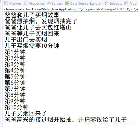 public class TestThreadState { public static void main(String[] args) { System.out.println("爸爸和儿子买烟故事"); Thread father = new Thread(new FatherThread()); father.start(); } } class FatherThread implements Runnable { public void run() { System.out.println("爸爸想抽烟,发现烟抽完了"); System.out.println("爸爸让儿子去买包红塔山"); Thread son = new Thread(new SonThread()); son.start(); System.out.println("爸爸等儿子买烟回来"); try { son.join(); } catch (InterruptedException e) { e.printStackTrace(); System.out.println("爸爸出门去找儿子跑哪去了"); // 结束JVM。如果是0则表示正常结束;如果是非0则表示非正常结束 System.exit(1); } System.out.println("爸爸高兴的接过烟开始抽,并把零钱给了儿子"); } } class SonThread implements Runnable { public void run() { System.out.println("儿子出门去买烟"); System.out.println("儿子买烟需要10分钟"); try { for (int i = 1; i <= 10; i++) { System.out.println("第" + i + "分钟"); Thread.sleep(1000); } } catch (InterruptedException e) { e.printStackTrace(); } System.out.println("儿子买烟回来了"); } }