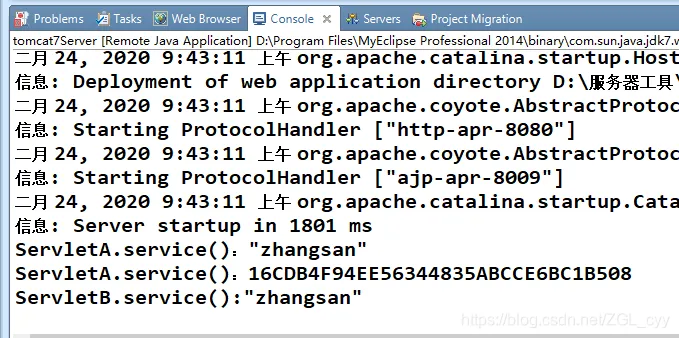 import java.io.IOException; import javax.servlet.ServletException; import javax.servlet.http.HttpServlet; import javax.servlet.http.HttpServletRequest; import javax.servlet.http.HttpServletResponse; import javax.servlet.http.HttpSession; public class ServletB extends HttpServlet { @Override protected void service(HttpServletRequest req, HttpServletResponse resp) throws ServletException, IOException { //设置请求编码格式 req.setCharacterEncoding("utf-8"); //设置响应 编码格式 resp.setContentType("text/html;charset=utf-8"); //获取请求信息 //获取Session对象 HttpSession session = req.getSession(); //获取A的处理结果数据 String uname=(String) session.getAttribute("uname"); //处理请求数据 //打印A流转的数据 System.out.println("ServletB.service():"+uname); //响应处理结果 //重定向 } }