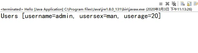 package com.zgl; public class Hello { public static void main(String[] args) { Users user=new Users(); user.setUserage(20); user.setUsername("admin"); user.setUsersex("man"); System.out.println(user); } }