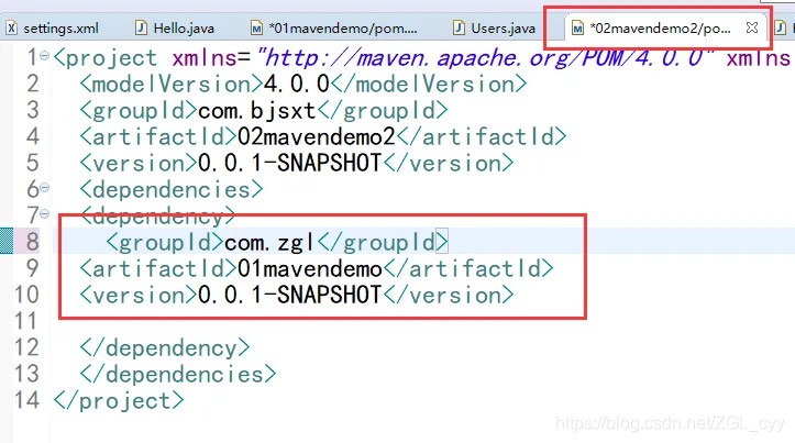 即 A 工程开发或运行过程中需要 B 工程提供支持,则代表 A 工程依赖 B 工程。在这种情况下,需要在 pom.xml 文件中增加下属配置定义依赖关系