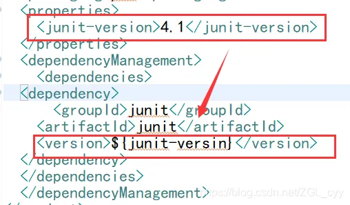 <project xmlns="http://maven.apache.org/POM/4.0.0" xmlns:xsi="http://www.w3.org/2001/XMLSchema-instance" xsi:schemaLocation="http://maven.apache.org/POM/4.0.0 http://maven.apache.org/xsd/maven-4.0.0.xsd"> <modelVersion>4.0.0</modelVersion> <groupId>com.bjsxt</groupId> <artifactId>03parent</artifactId> <version>0.0.1-SNAPSHOT</version> <packaging>pom</packaging> <properties> <junit-version>4.1</junit-version> </properties> <dependencyManagement> <dependencies> <dependency> <groupId>junit</groupId> <artifactId>junit</artifactId> <version>${junit-versin}</version> </dependency> </dependencies> </dependencyManagement> </project>