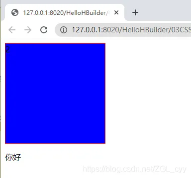 <!DOCTYPE html> <html> <head> <meta charset="utf-8"> <title></title> <style> /*通用选择器 *代表该页面中的所有的元素 */ /**{ color: red; background-color: black; }*/ /*元素选择器*/--> div{ width: 200px; height: 200px; /*背景颜色*/ background-color: blue; /*边框的粗细 边框的风格 边框的颜色 */ border: 1px solid red; } /*ID选择器 #id的名称 id的名称保证唯一 * ID的命名: 数字、字母、下划线、中划线组成,不能用数字开头 * */ #div1{ background-color: green; } /*class类选择器*/ .div_1{ background-color: pink; } </style> </head> <body> <!--<div class="div_1">1</div>--> <div>2</div> <!--<div class="div_1">3</div>--> <p>你好</p> </body> </html>