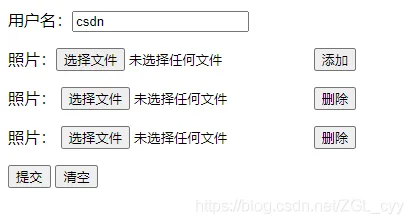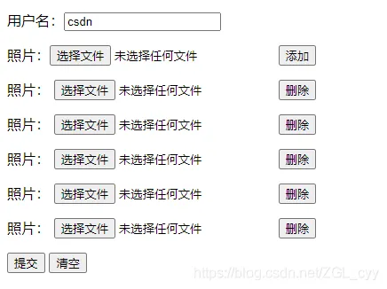 <!DOCTYPE html> <html> <head> <meta charset="utf-8"> <title></title> <script> function addNode(){ //获得表单对象 var fom=document.getElementById("fom"); //创建节点的方法 var p= document.createElement("p"); p.innerText="照片: " var inp=document.createElement("input"); inp.type="file"; var inp2=document.createElement("input"); inp2.type="button"; inp2.value="删除"; inp2.onclick=function(){ //移除子节点; p.removeChild(inp); p.removeChild(inp2); //移除本身 p.remove(); } //添加节点对象 // fom.appendChild(p); //获得最后一个节点对象 var lastNode=document.getElementById("lastNode"); //在指定元素之前添加节点 fom.insertBefore(p,lastNode); p.appendChild(inp); p.appendChild(inp2); } </script> </head> <body> <form id="fom"> <p> 用户名:<input type="text" /> </p> <p> 照片:<input type="file" /> <input type="button" value="添加" onclick="addNode()"/> </p> <p id="lastNode"> <input type="button" name="" id="" value="提交" /> <input type="button" name="" id="" value="清空" /> </p> </form> </body> </html>