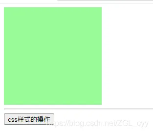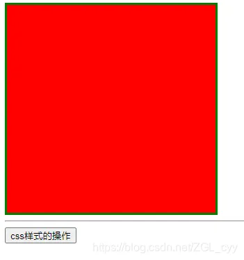 <!DOCTYPE html> <html> <head> <meta charset="utf-8"> <title></title> <script> function demo1(){ //获得id名称是div1的对象 var div =document.getElementById("div1"); //获得css样式 只是支持行内样式的css var wi=div.style.width; var hi=div.style.height; // alert(wi+"----"+hi); //操作元素的css样式 对于 background-color格式的样式在js中需要使用驼峰规则进行改变 div.style.width="300px"; div.style.height="300px"; div.style.backgroundColor="red"; //通过增加class类来增加对应的css样式 注意:className div.className="div2"; } </script> <style> .div2{ border: 3px solid green; } </style> </head> <body > <div id="div1" style="width: 200px; height: 200px; background-color: palegreen;"></div> <hr /> <input type="button" name="" id="" value="css样式的操作" onclick="demo1()" /> </body> </html>