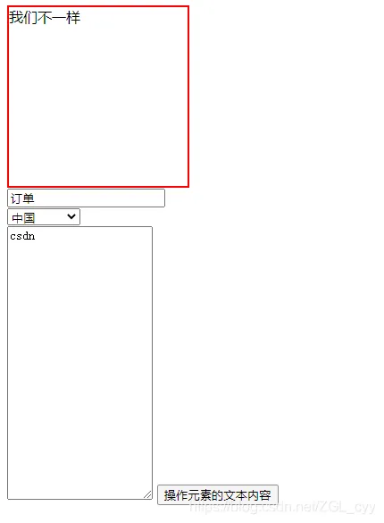 <!DOCTYPE html> <html> <head> <meta charset="utf-8"> <title></title> <style> #div1{ width: 200px; height: 200px; border: 2px solid red; } </style> <script> function demo1(){ //获得div1的对象 var div=document.getElementById("div1"); //获得元素的文本内容 //会获得里面的HTML中的内容 var inn=div.innerHTML; //只会获得文本的信息 var inn2=div.innerText; // console.log(inn); // console.log(inn2); //会识别HTML信息 //div.innerHTML="<h1>我们没有什么不一样</h1>" //不会识别HTML的信息 div.innerText+="<h1>我们没有什么不一样</h1>" /* * 注意: * * 双标签有innerHTML和innerText, * * 单标签获得的时候都是用value获得 * * * 特殊的标签: * * select、textarea * * * */ } function demo2(){ //获得select对象 var sel=document.getElementById("sele"); alert(sel.value); } function demo3(){ var te= document.getElementById("tex"); alert(te.value); } </script> </head> <body > <div id="div1"> <span>我们不一样</span> </div> <input type="text" name="inp2" id="inp2" value="" /> <br /> <!--特殊的操作--> <select id="sele" onchange="demo2()"> <option value="0">--请选择--</option> <option value="1">中国</option> <option value="2">美国</option> </select> <br /> <textarea rows="20" cols="20" id="tex">1223455</textarea> <input type="button" value="操作元素的文本内容" onclick="demo3()" /> </body> </html>