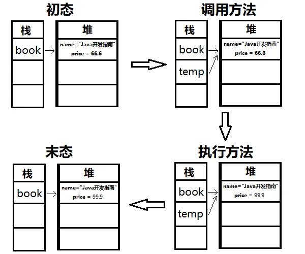 //引用数据类型作为方法参数被调用 class Book{ String name; double price; public Book(String name,double price){ this.name = name; this.price = price; } public void getInfo(){ System.out.println("图书名称:"+ name + ",价格:" + price); } public void setPrice(double price){ this.price = price; } } public class Main{ public static void main(String[] args){ Book book = new Book("Java开发指南",66.6); book.getInfo(); //图书名称:Java开发指南,价格:66.6 fun(book); book.getInfo(); //图书名称:Java开发指南,价格:99.9 } public static void fun(Book temp){ temp.setPrice(99.9); } }