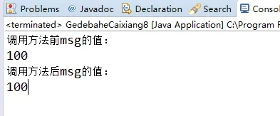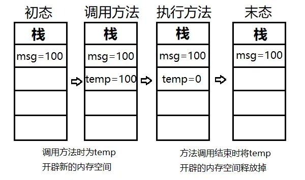 //基本数据类型作为方法参数被调用 public class Main{ public static void main(String[] args){ int msg = 100; System.out.println("调用方法前msg的值:\n"+ msg); //100 fun(msg); System.out.println("调用方法后msg的值:\n"+ msg); //100 } public static void fun(int temp){ temp = 0; } }