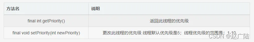 public class ThreadPriority extends Thread { @Override public void run() { for (int i = 0; i < 100; i++) { System.out.println(getName() + ":" + i); } } } public class ThreadPriorityDemo { public static void main(String[] args) { ThreadPriority tp1 = new ThreadPriority(); ThreadPriority tp2 = new ThreadPriority(); ThreadPriority tp3 = new ThreadPriority(); tp1.setName("高铁"); tp2.setName("飞机"); tp3.setName("汽车"); //public final int getPriority():返回此线程的优先级 System.out.println(tp1.getPriority()); //5 System.out.println(tp2.getPriority()); //5 System.out.println(tp3.getPriority()); //5 //public final void setPriority(int newPriority):更改此线程的优先级 // tp1.setPriority(10000); //IllegalArgumentException System.out.println(Thread.MAX_PRIORITY); //10 System.out.println(Thread.MIN_PRIORITY); //1 System.out.println(Thread.NORM_PRIORITY); //5 //设置正确的优先级 tp1.setPriority(5); tp2.setPriority(10); tp3.setPriority(1); tp1.start(); tp2.start(); tp3.start(); } }