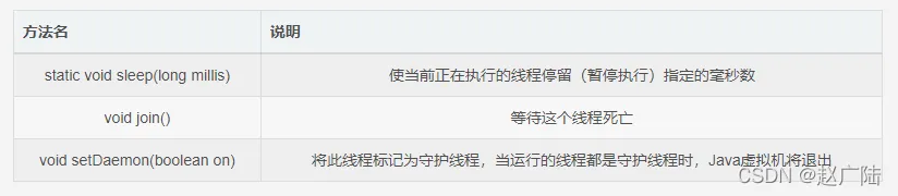 public class ThreadSleep extends Thread { @Override public void run() { for (int i = 0; i < 100; i++) { System.out.println(getName() + ":" + i); try { Thread.sleep(1000); } catch (InterruptedException e) { e.printStackTrace(); } } } } public class ThreadSleepDemo { public static void main(String[] args) { ThreadSleep ts1 = new ThreadSleep(); ThreadSleep ts2 = new ThreadSleep(); ThreadSleep ts3 = new ThreadSleep(); ts1.setName("曹操"); ts2.setName("刘备"); ts3.setName("孙权"); ts1.start(); ts2.start(); ts3.start(); } }