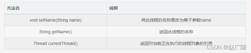 public class MyThread extends Thread { public MyThread() {} public MyThread(String name) { super(name); } @Override public void run() { for (int i = 0; i < 100; i++) { System.out.println(getName()+":"+i); } } } public class MyThreadDemo { public static void main(String[] args) { MyThread my1 = new MyThread(); MyThread my2 = new MyThread(); //void setName(String name):将此线程的名称更改为等于参数 name my1.setName("高铁"); my2.setName("飞机"); //Thread(String name) MyThread my1 = new MyThread("高铁"); MyThread my2 = new MyThread("飞机"); my1.start(); my2.start(); //static Thread currentThread() 返回对当前正在执行的线程对象的引用 System.out.println(Thread.currentThread().getName()); } }
