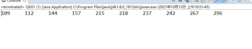 public class QK01 { public static void main(String[] args) { int[] arr = new int[10]; Random random = new Random(); for(int i = 0;i<arr.length;i++) { arr[i] = random.nextInt(201)+100; } Arrays.sort(arr); for (int a : arr) { System.out.print(a+"\t"); } } }