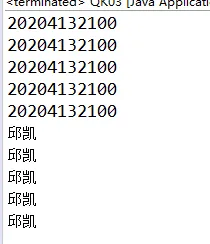 public class QK03 { public static void main(String[] args) { MyRunable1 mr1 = new MyRunable1(); new Thread(mr1,"20204132100").start(); MyRunable2 mr2 = new MyRunable2(); new Thread(mr2,"邱凯").start(); } } class MyRunable1 implements Runnable{ @Override public void run() { for(int i=1;i<=5;i++) { System.out.println(Thread.currentThread().getName()); } } } class MyRunable2 implements Runnable{ @Override public void run() { for(int i=1;i<=5;i++) { System.out.println(Thread.currentThread().getName()); } } }