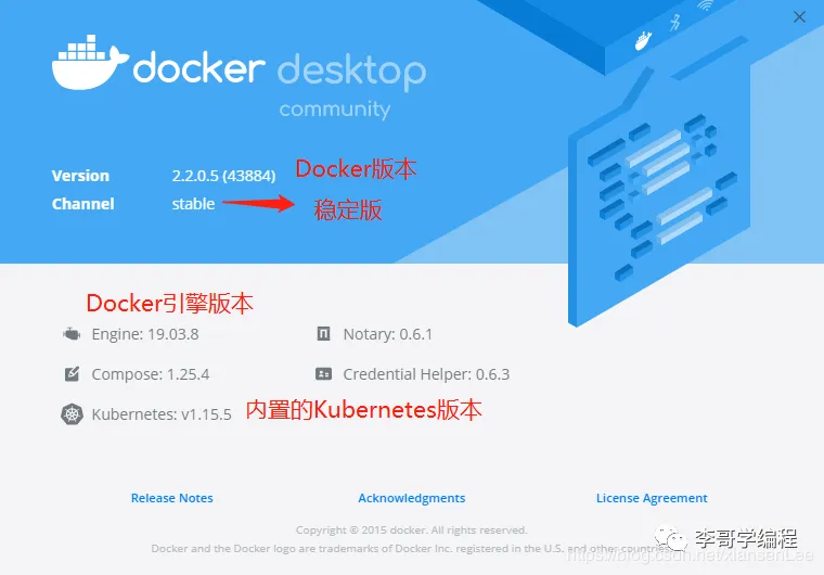 这里,点击上图右键菜单中的About Docker Desktop,可以看到,我们安装的Docker的一些版本信息,我标出了常用的几个。