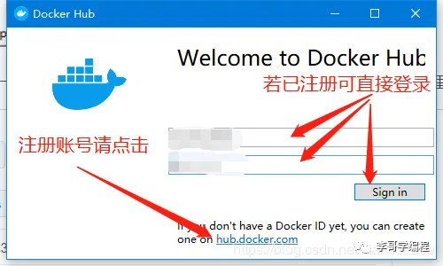 之所以选择此时创建,其实是因为此时桌面会有一个弹窗,显示welcome,并让你注册账号,所以就顺便选择注册了,一劳永逸嘛,如果不小心被你叉掉了,那也可以通过点击上图中的Sign in/Create Docker ID...来创建,注册过程就不多说了。