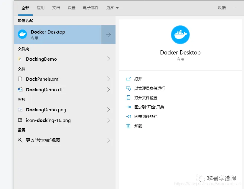 开始里搜索Docker for Windows,然后点开,你会发现在,在右下角出现一个很小巧的背着好多箱子的鲸鱼