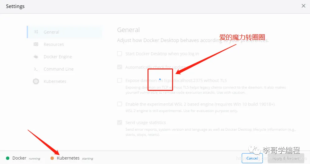 界面会一直卡在这里,动也动不了,关也管不掉,然后就免不了一番折腾了,其实,这个并不是什么配置问题导致的,而是因为,docker内置的Kubernetes的镜像下载需要翻墙,没错,就是这么坑,如果你被墙了就会这样,而如果你在墙外,那么恭喜,你可以顺利搞定了。如果你遇到这种情况,别急,跟着以下的正常流程操作,完成之后重启docker即可。