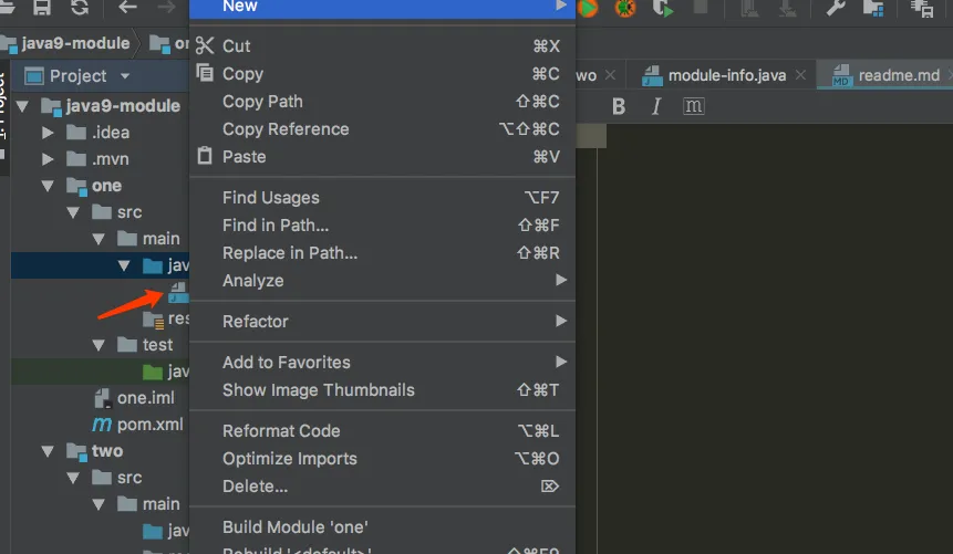 2.1 必须是java文件夹下面才可以创建module-info.java,添加两个maven。module项目。
