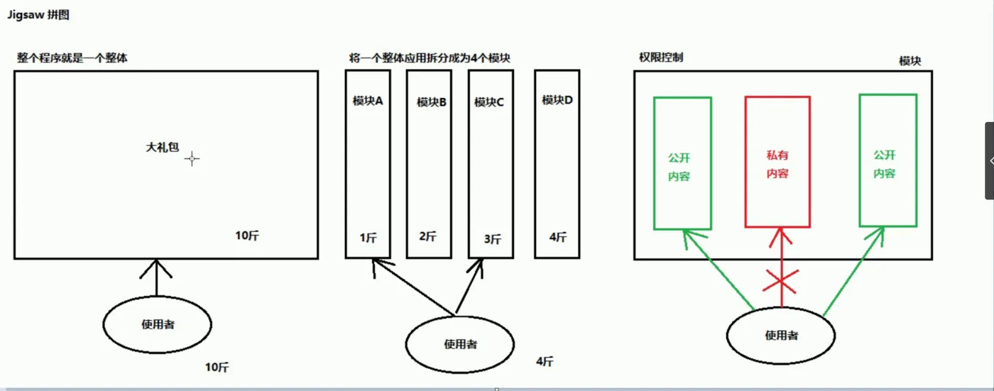 Java 语言随着这些年的发展已经成为了一门影响深远的编程语言,无数平台,系统都采用 Java 语言编写。但是,伴 随着发展,Java 也越来越庞大,逐渐发展成为一门 “ 臃肿 ” 的语言。而且,无论是运行一个大型的软件系统,还是运 行一个小的程序,即使程序只需要使用Java 的部分核心功能, JVM 也要加载整个 JRE 环境。 为了给 Java“ 瘦身 ” ,让 Java实现轻量化, Java 9 正式的推出了模块化系统。 Java 被拆分为 N 多个模块,并允许 Java 程序可以根据需要选择加载程序必须的Java 模块,这样就可以让 Java 以轻量化的方式来运行
