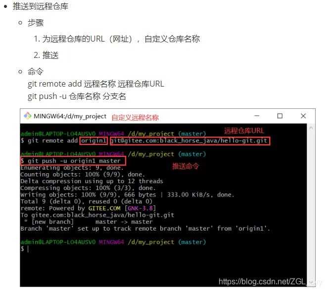通过推送将自己的本地仓库全部推送至远程仓库,然后还要告诉推送到那个分支