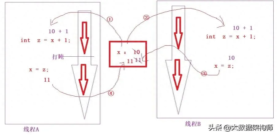 线程A先获取x的值,并且执行 z = x +1, 这时线程A打个盹,线程B获取x的值,并且执行 z = x + 1,然后将z的值写入x变量。 这时x就从10被修改为11。 这时线程A醒了,直接将自己计算的z(还是11)的值写入x变量。就会导致x的值从11修改为11。这时我们会发现,线程B的加1操作被覆盖了。这就导致线程B的这次+1操作失败了。