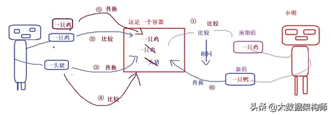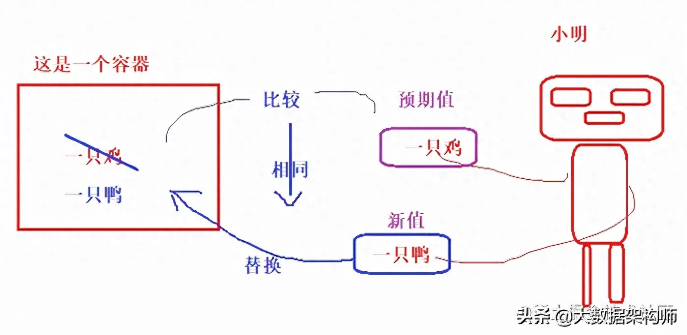 稍微说明一下:一个容器里面有一只鸡,小明同学左手一只鸡,右手一只鸭。左手的鸡就是容器里面的预期值,如果左手的小鸡和容器里面的小鸡一样,就拿右手的小鸭把容器里的小鸡替换了。如果左手的预期值和容器里的小鸡不一样,那就算了,就不换了。