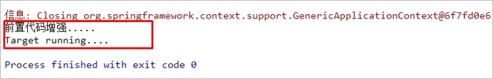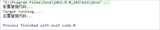 @Component("target") public class Target implements TargetInterface { @Override public void method() { System.out.println("Target running...."); } } @Component("myAspect") public class MyAspect { public void before(){ System.out.println("前置代码增强....."); } }