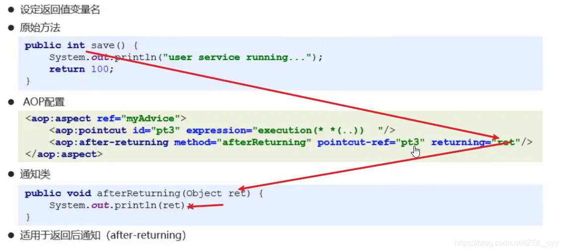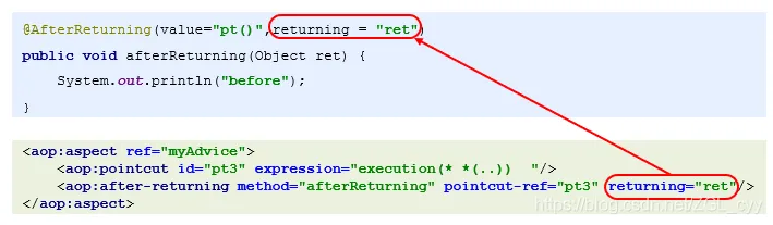 @AfterReturning(value=“pt()”,returning = “ret”)