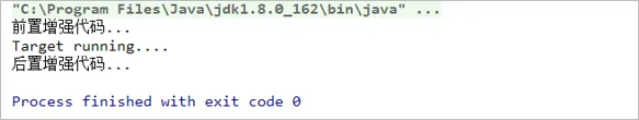 Target target = new Target(); //创建目标对象 //创建代理对象 TargetInterface proxy = (TargetInterface) Proxy.newProxyInstance(target.getClass() .getClassLoader(),target.getClass().getInterfaces(),new InvocationHandler() { @Override public Object invoke(Object proxy, Method method, Object[] args) throws Throwable { System.out.println("前置增强代码..."); Object invoke = method.invoke(target, args); System.out.println("后置增强代码..."); return invoke; } } );