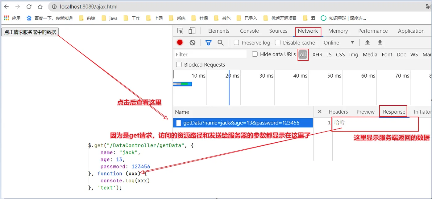 @WebServlet("/DataController/*") public class DataController extends BaseServlet { public void getData(HttpServletRequest request, HttpServletResponse response)throws Exception{ //获取前端传过来的数据,并打印到控制台 String name = request.getParameter("name"); String age = request.getParameter("age"); String password = request.getParameter("password"); System.out.println(name+","+age+","+password); //向前端返回的数据是:"哈哈" response.getWriter().print("哈哈"); } }