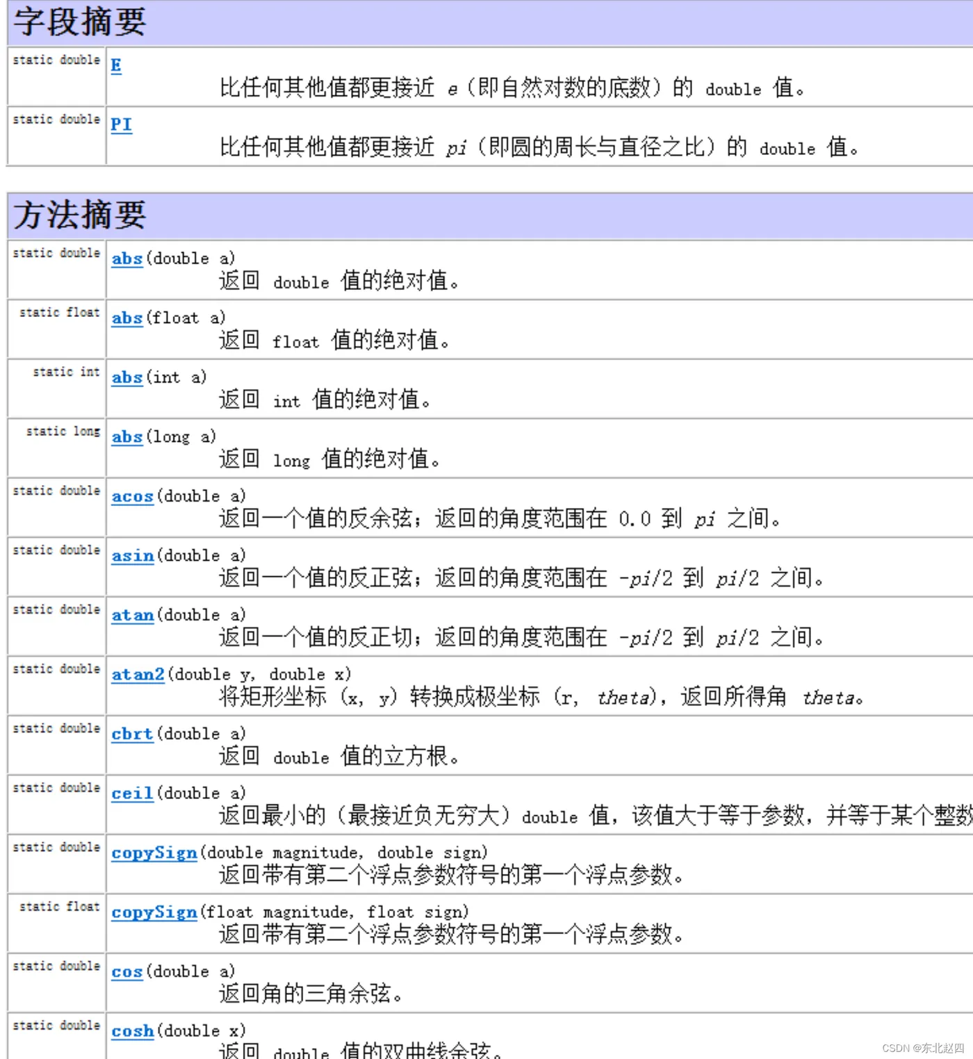 在API文档中没有体现可用的构造方法,因此我们就不能直接通过new关键字去创建Math类的对象。同时我们发现Math类中的方法都是静态的,因此在使用的时候我们可以直接通过类名去调用。在Math类中