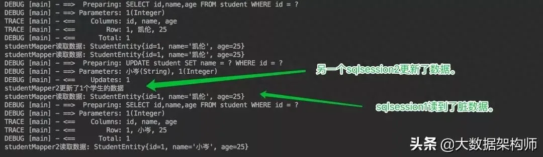 开启两个SqlSession,在sqlSession1中查询数据,使一级缓存生效,在sqlSession2中更新数据库,验证一级缓存只在数据库会话内部共享。