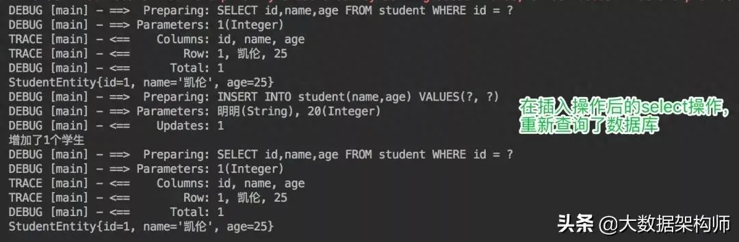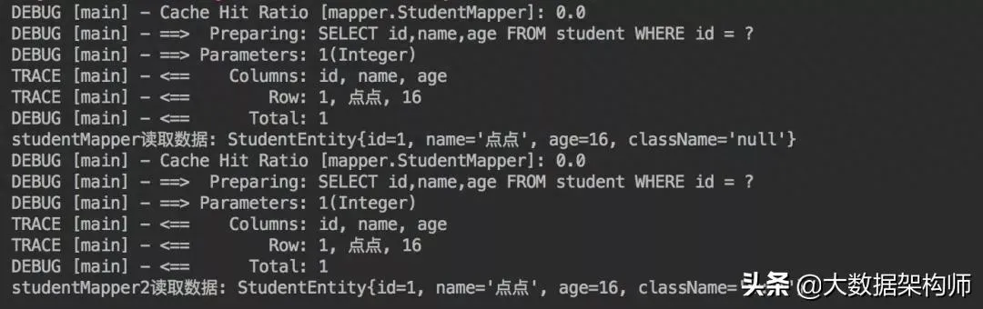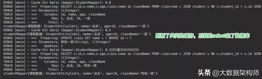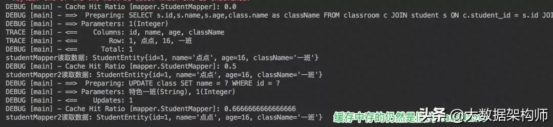 为了解决实验4的问题呢,可以使用Cache ref,让ClassMapper引用StudenMapper命名空间,这样两个映射文件对应的SQL操作都使用的是同一块缓存了。