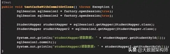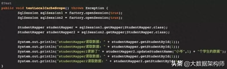 开启一级缓存,范围为会话级别,调用三次getStudentById,代码如下所示: